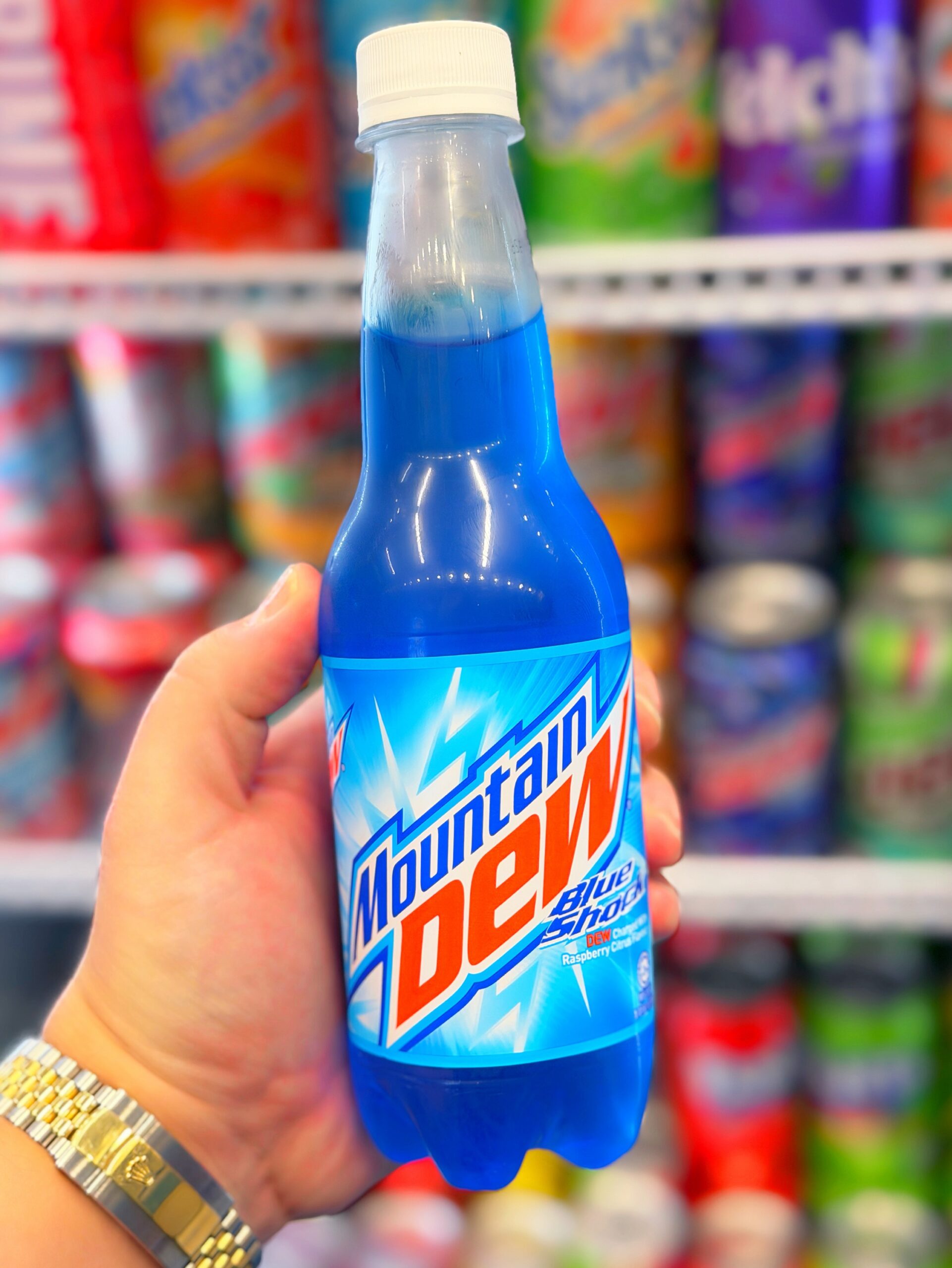 Blue shock Mountain Dew is raspberry citrus flavoured! Straight from Malaysia! Available @ Exotic Snax GTA!