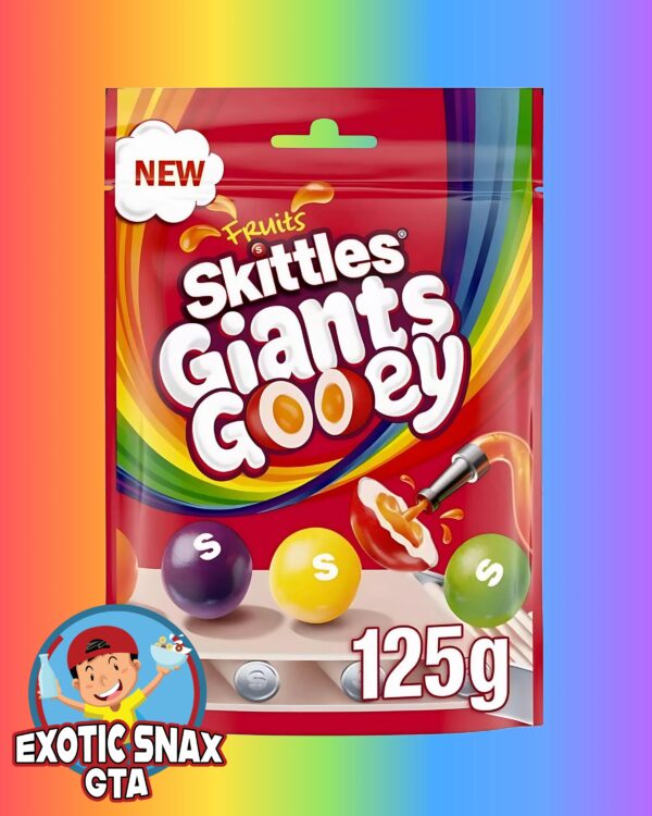 Skittles giants gooey are giant skittles with a gushers like filling inside of them! Straight from the UK! Available @ Exotic Snax GTA!